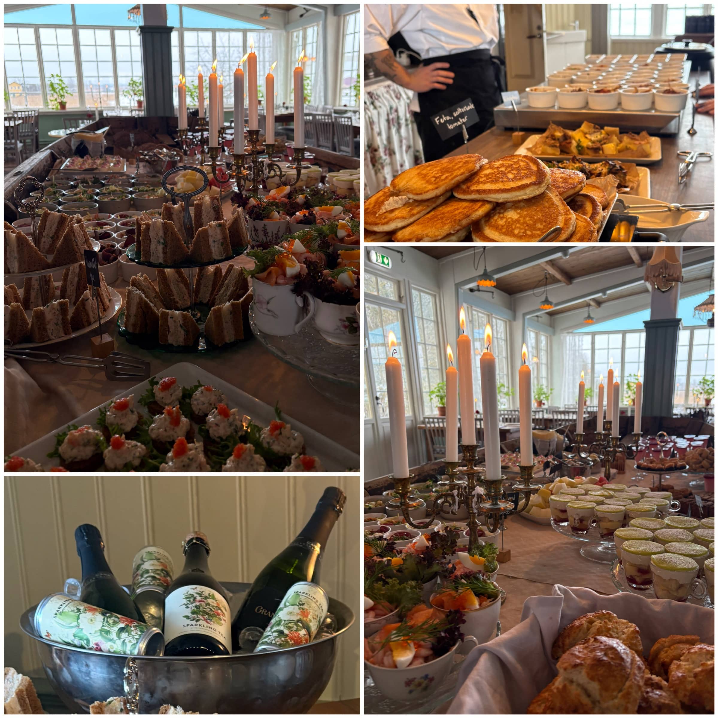 På buffén finns även kaffe och te sen beställer ni själva vad ni vill dricka till. Vi rekommenderar att starta med ett glas bubbel, Cava eller Sparkling Tea.